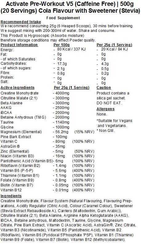 Activate is specifically formulated to enhance athletic performance and mental alertness. Activate includes a combination of ingredients at powerful yet safe doses to help increase training intensity. A full ingredient list and dosages are stated in the nutritional information tab.