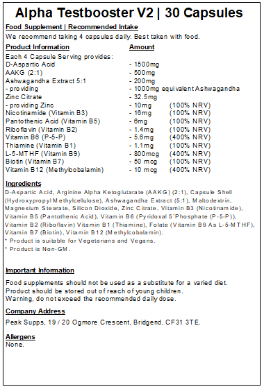 Peak Supps Alpha Test Booster V2 includes a powerful combination of herbal extracts, botanicals, amino acids, vitamins & minerals. Alpha Test Booster V2 aids to strength and reduces tiredness & fatigue. The ingredients also support general health, energy levels and immunity.