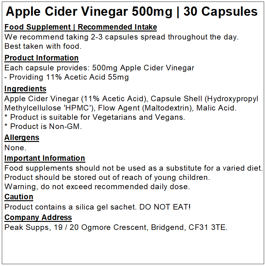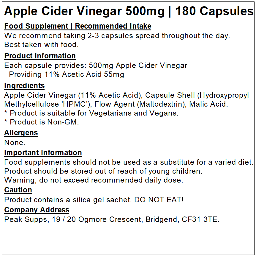 Peak Supps Apple Cider Vinegar Capsules are suitable for those looking for a high-quality Apple Cider Vinegar supplement. They are suitable for the general public and athletes.