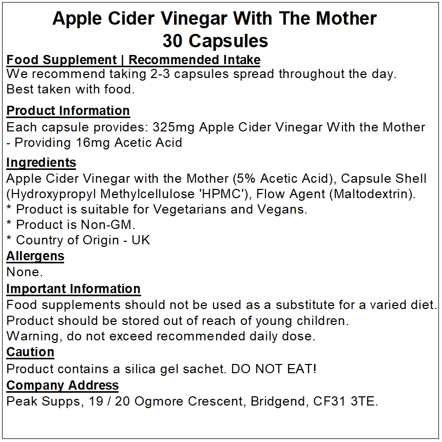 Peak Supps Apple Cider Vinegar Capsules are suitable for those looking for a high-quality Apple Cider Vinegar supplement. They are suitable for the general public and athletes.