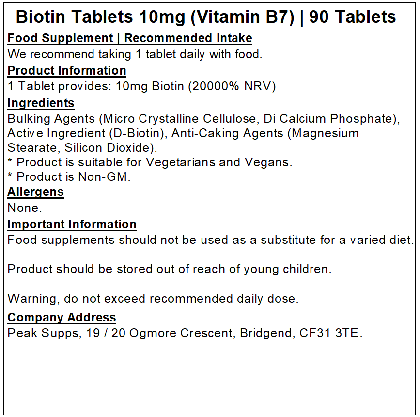 Peak Supps Biotin Tablets provide 10mg of Biotin (Vitamin B7) per tablet. Each tablet providing 20,000% of your daily NRV.