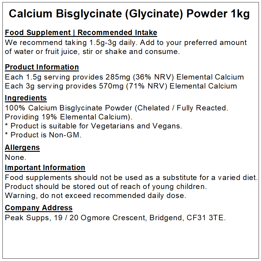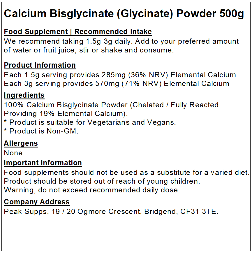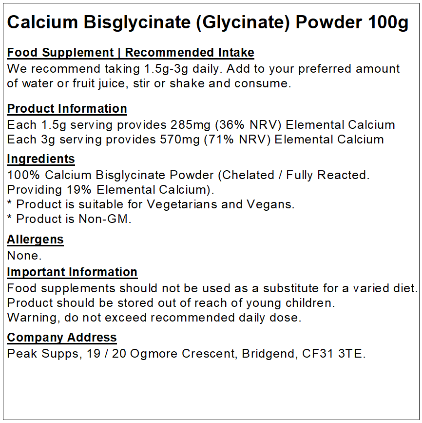 For individuals who are lactose intolerant or vegan, it can be difficult to maintain calcium levels. Calcium contributes to normal muscle function and is needed for the maintenance of normal bones and teeth. Peak Supps Calcium Bisglycinate Powder provides 285mg of Elemental Calcium (36% NRV) in each 1.5g serving.