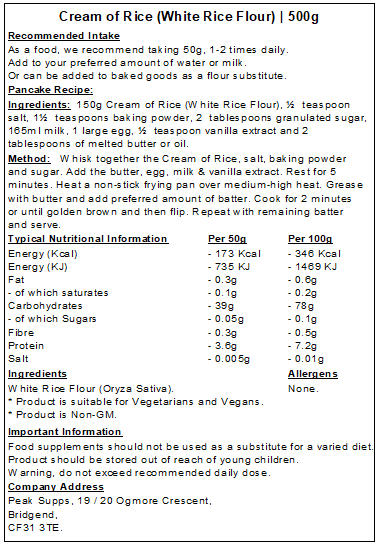 Peak Supps Cream of Rice (White Rice Flour) is suitable for those looking for a high-quality food to add to their diet. They are suitable for the general public and athletes.