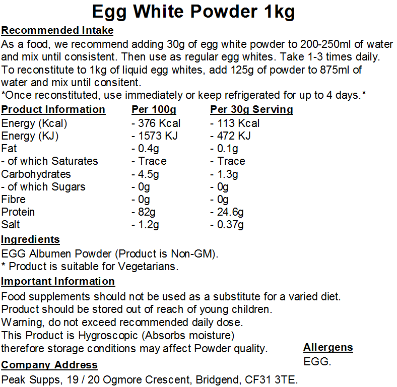 As a food supplement, we recommend adding 30g of Egg White Powder to 200-250ml of water. Take 1-3 times daily.
