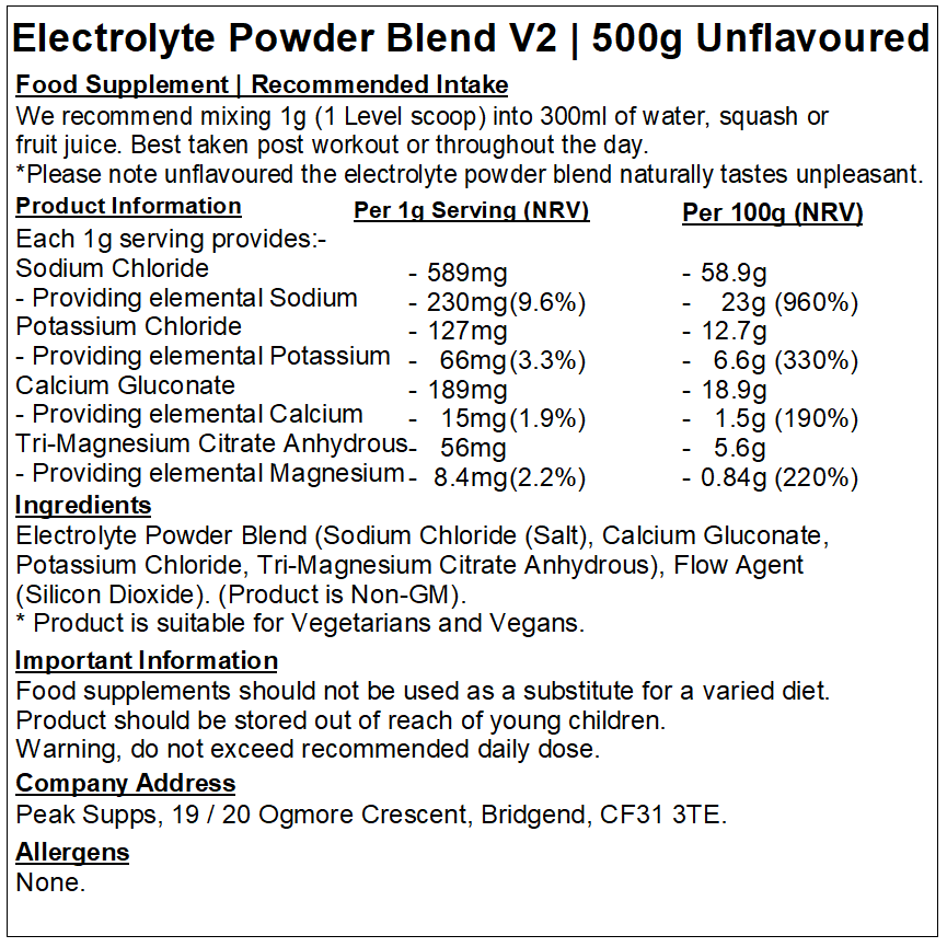 Peak Supps Electrolyte powder blend contains four essential ingredients: sodium, potassium, calcium and magnesium.
