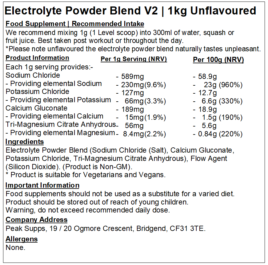 Electrolyte Powder Blend (Sodium Chloride (Salt), Calcium Gluconate, Potassium Chloride, Tri-Magnesium Citrate Anhydrous), Flow Agent (Silicon Dioxide).
