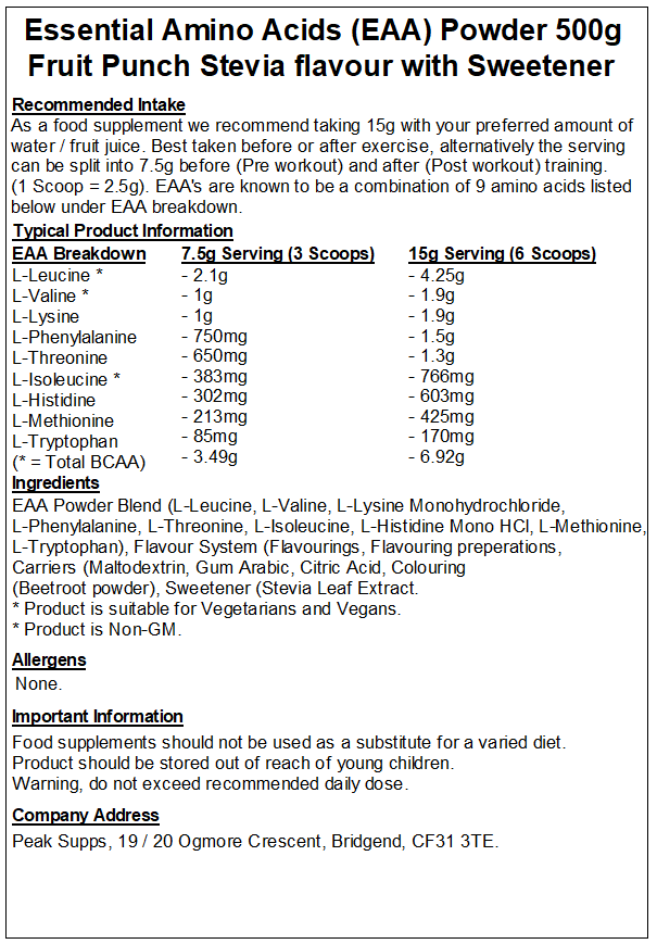 Fruit Punch - Essential Amino Acid Powder Blend (L-Leucine, L-Isoleucine, L-Lysine, L-Valine, L-Phenylalanine, L-Threonine, L-Histidine, L-Methionine, L-Tryptophan), Flavouring (Citric Acid (E33) (Acidity Regulator), Colour (E162), Sucralose (E995) (Sweetener).