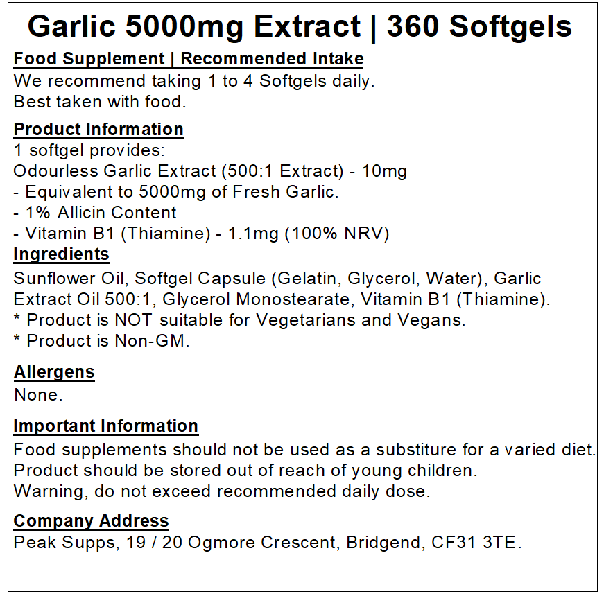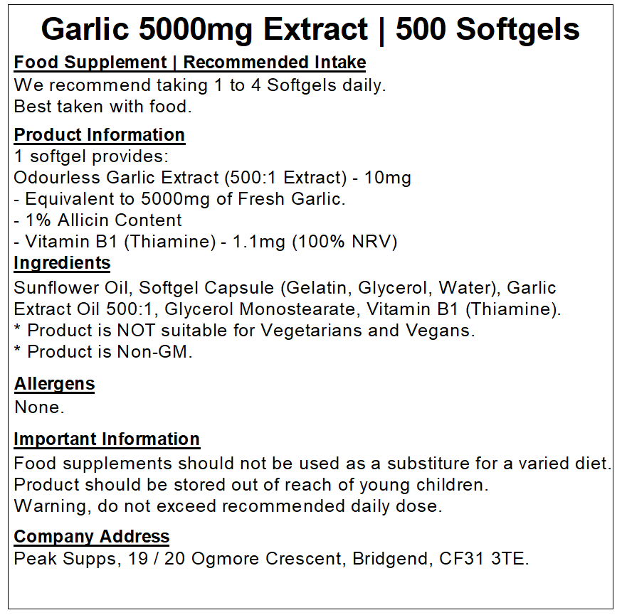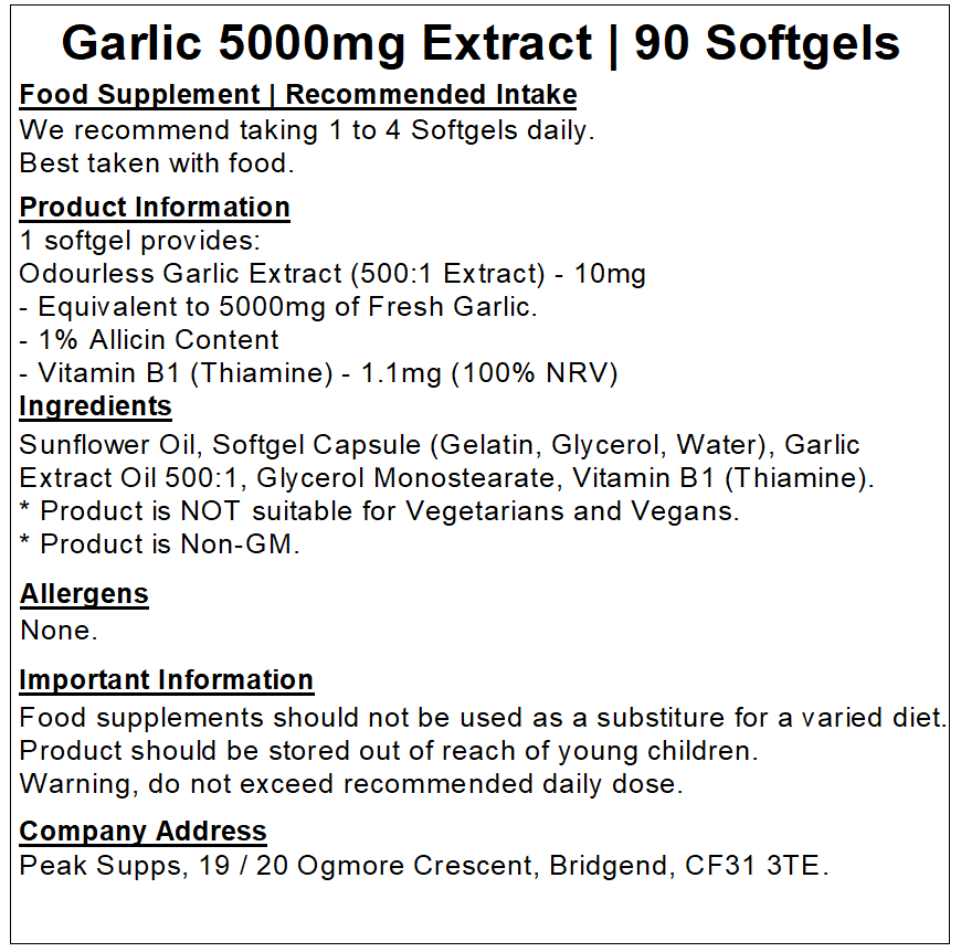 Garlic (Allium sativum L.) is a common household ingredient that has multiple uses and benefits. It has been a popular natural choice for centuries to aid healing and a range of complaints. Peak Supps Garlic Softgels offer the health benefits, without the unpleasant taste associated with Garlic.