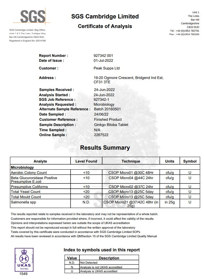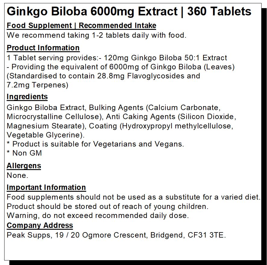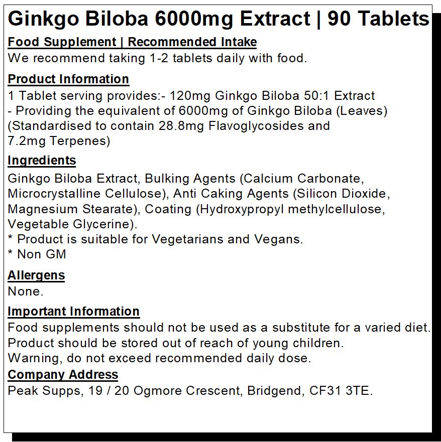 Peak Supps Ginkgo Biloba Tablets provide 28.8mg Flavone Glycosides & 7.2mg Terpene Lactones.