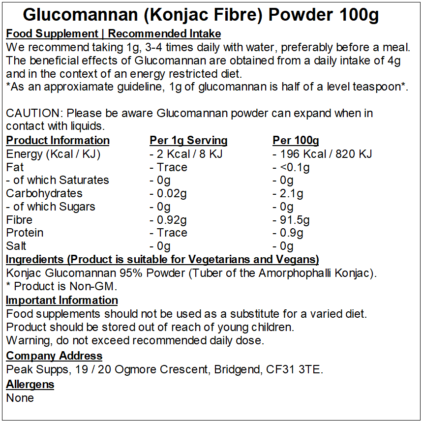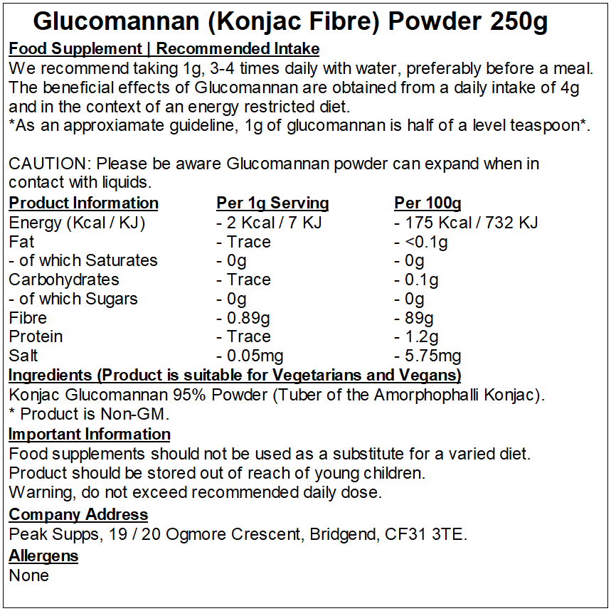Glucomannan (Konjac Fibre) is a dietary fibre, formed from the root of the konjac plant. Glucomannan is used for constipation, weight loss and a range of other conditions. Peak Supps Glucomannan Powder is a natural, popular appetite suppressant and weight loss supplement.
