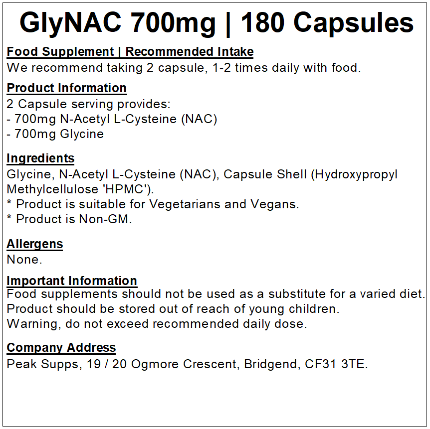 Glycine and N-Acetyl L-Cysteine (NAC) are powerful amino acids combination that are used in replenishing Glutathione, an antioxidant produced naturally in the body. Peak Supps GlyNAC 700mg Capsules provide 700mg of NAC & 700mg of Glycine in each 2 capsule serving. They are Non-GM and are suitable for vegans and vegetarians.