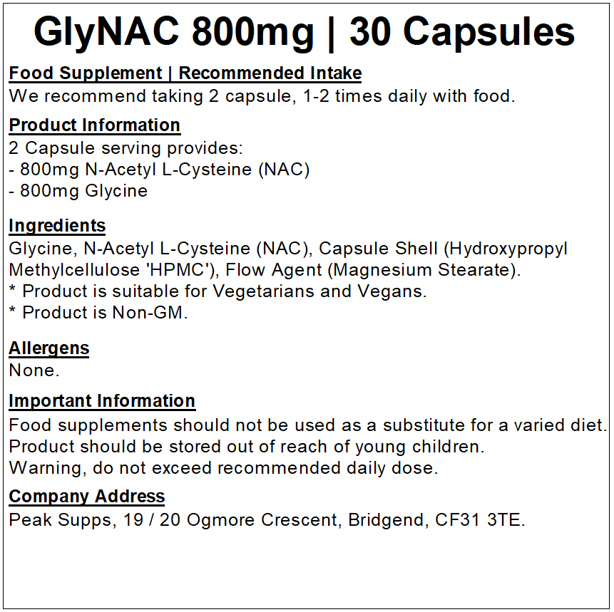 Glycine and N-Acetyl L-Cysteine (NAC) are powerful amino acids combination that are used in replenishing Glutathione, an antioxidant produced naturally in the body. Peak Supps GlyNAC 800mg Capsules provide 800mg of NAC & 800mg of Glycine in each 2 capsule serving. They are Non-GM and are suitable for vegans and vegetarians.