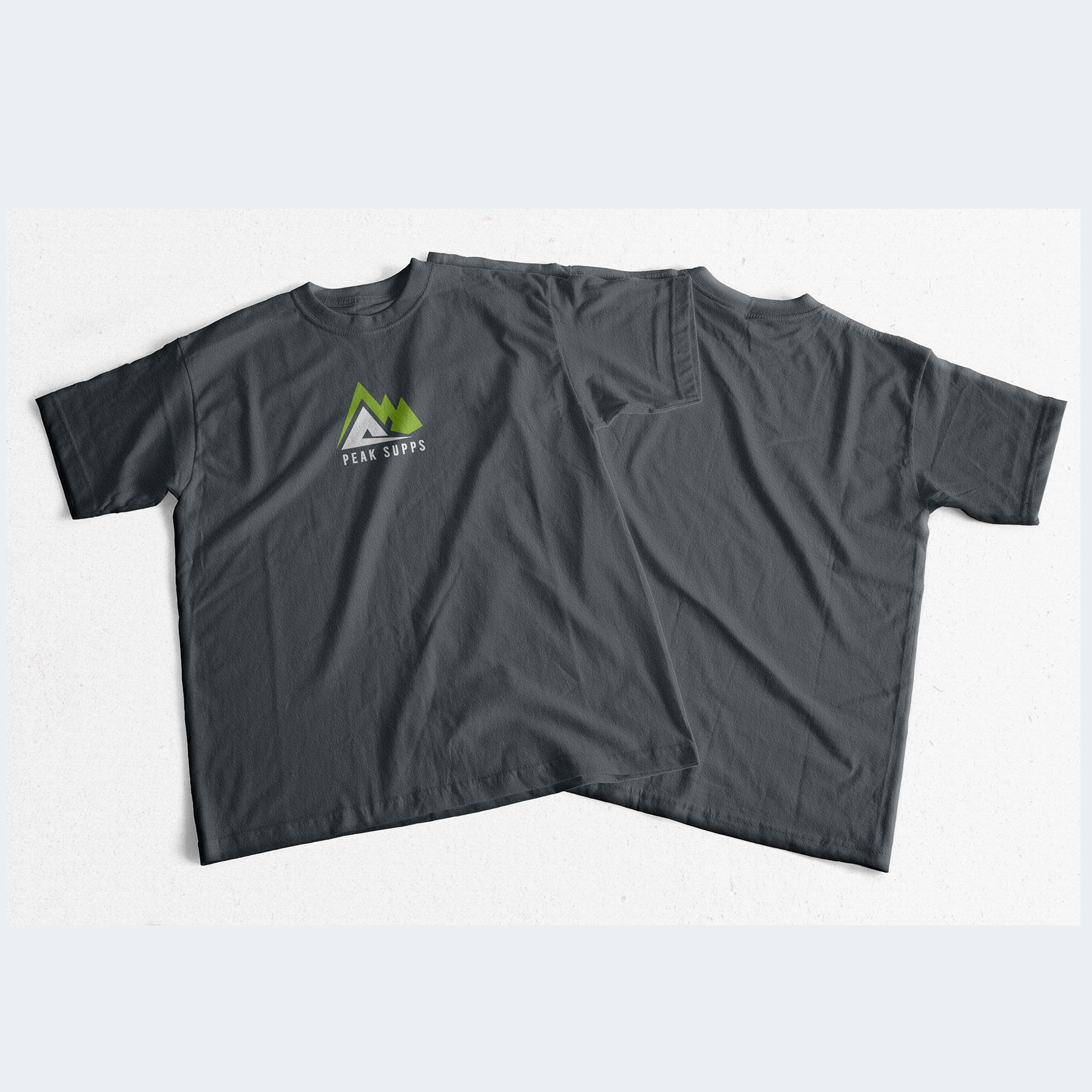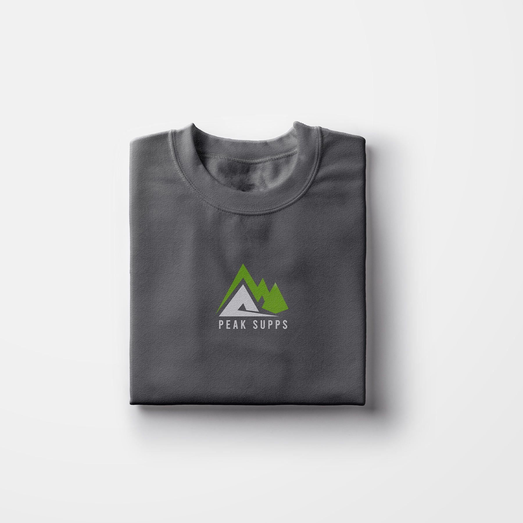 Peak Supps grey basic unisex T-shirt with white & green centre logo.