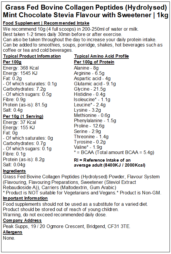 Mint Chocolate Stevia - Grass Fed Bovine Collagen Peptides (Hydrolysed), Flavour System (Flavouring, Flavouring Preparations, Sweetener (Stevia Extract Rebaudioside A), Carriers (Maltodextrin, Gum Arabic).