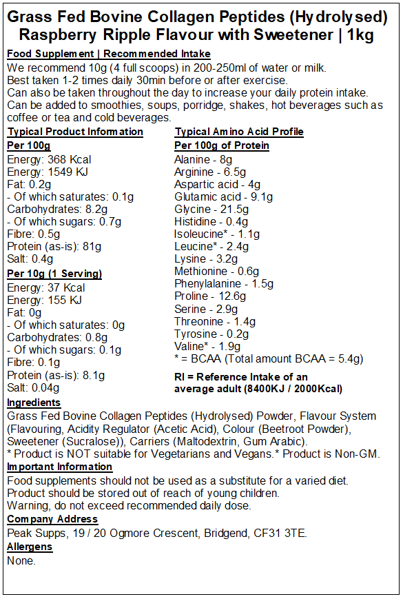 Raspberry Ripple - Grass Fed Bovine Collagen Peptides (Hydrolysed), Flavour System (Flavouring, Acidity Regulator (Acetic Acid), Colour (Beetroot Powder), Sweetener (Sucralose), Carriers (Maltodextrin, Gum Arabic)).
