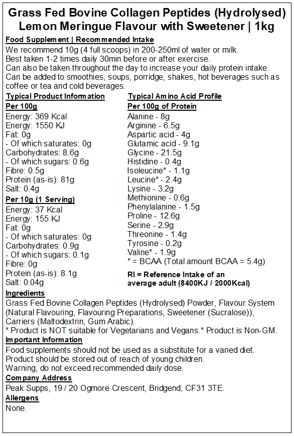 Lemon Meringue - Grass Fed Bovine Collagen Peptides (Hydrolysed), Flavour System (Natural Flavouring, Flavouring Preparations, Sweetener (Sucralose)), Carriers (Maltodextrin, Gum Arabic).