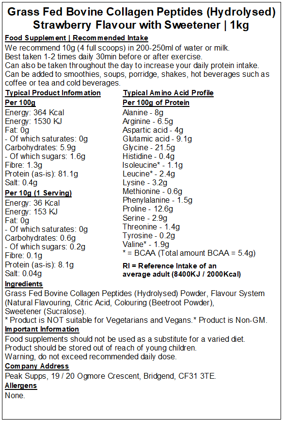 Strawberry - Grass Fed Bovine Collagen Peptides (Hydrolysed), Flavour System (Natural Flavouring, Citric Acid, Beetroot Powder, Sucralose (Sweetener).