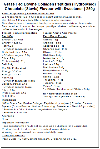 Chocolate Stevia - Grass Fed Bovine Collagen Peptides (Hydrolysed), Flavour System (Cocoa Powder, Natural Flavouring, Sweetener (Steviol Glycosides)).