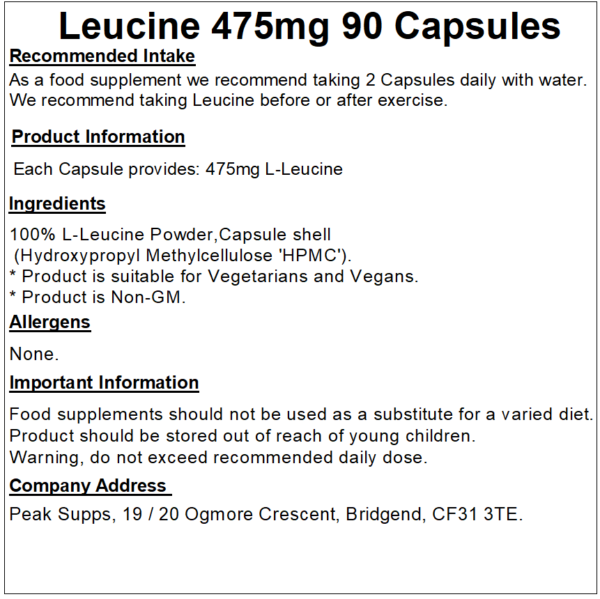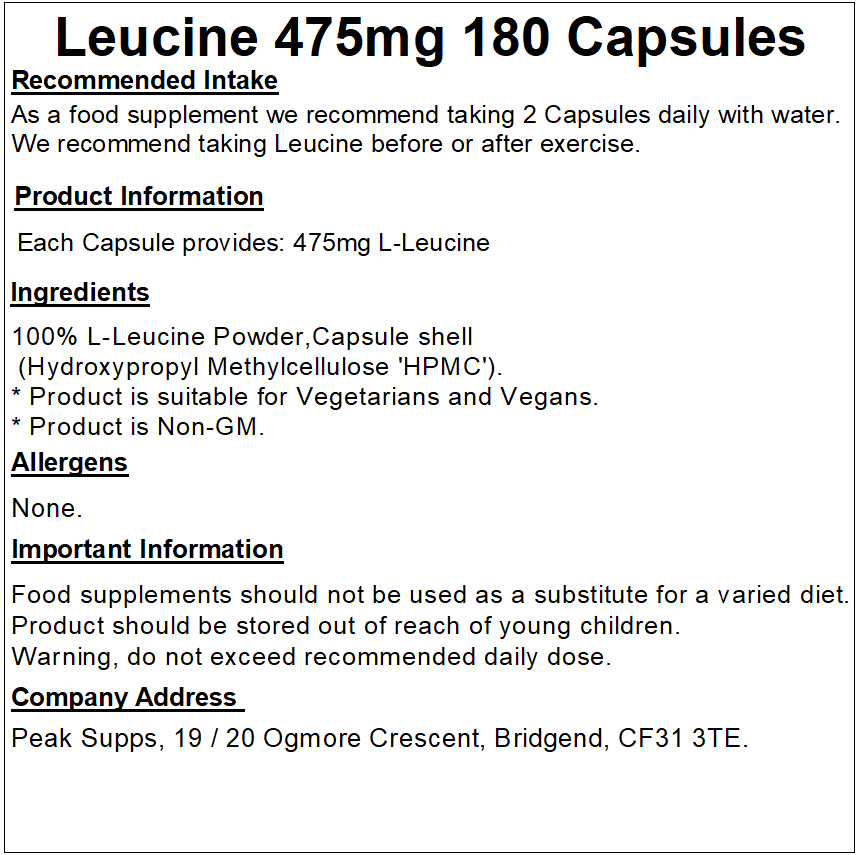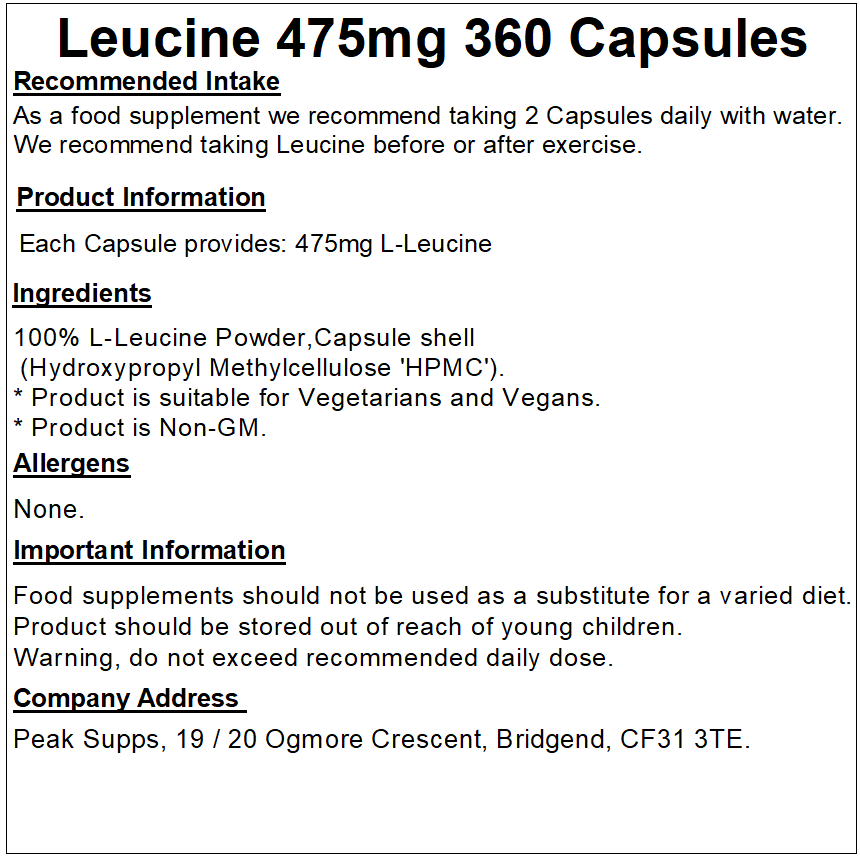 100% L-Leucine Powder, Capsule shell (Hydroxypropyl Methylcellulose ‘HPMC’).