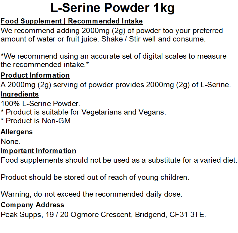 L-Serine also plays a role in protein synthesis, elevated levels are beneficial to the body’s recovery and repair process. Peak Supps L-Serine is 100% pure L-Serine with nothing added or taken away.