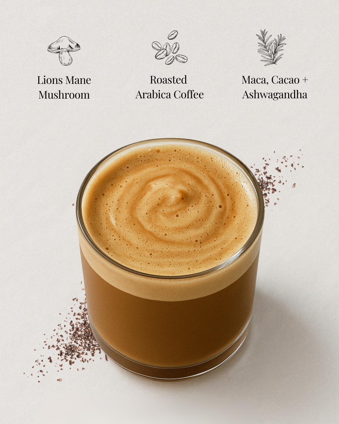 Roasted Arabica Coffee, Lions Mane Mushroom Extract Powder, Medium Chain Triglyceride Oil, Ashwagandha Root Powder, Maca Root Powder, Cacao Powder.