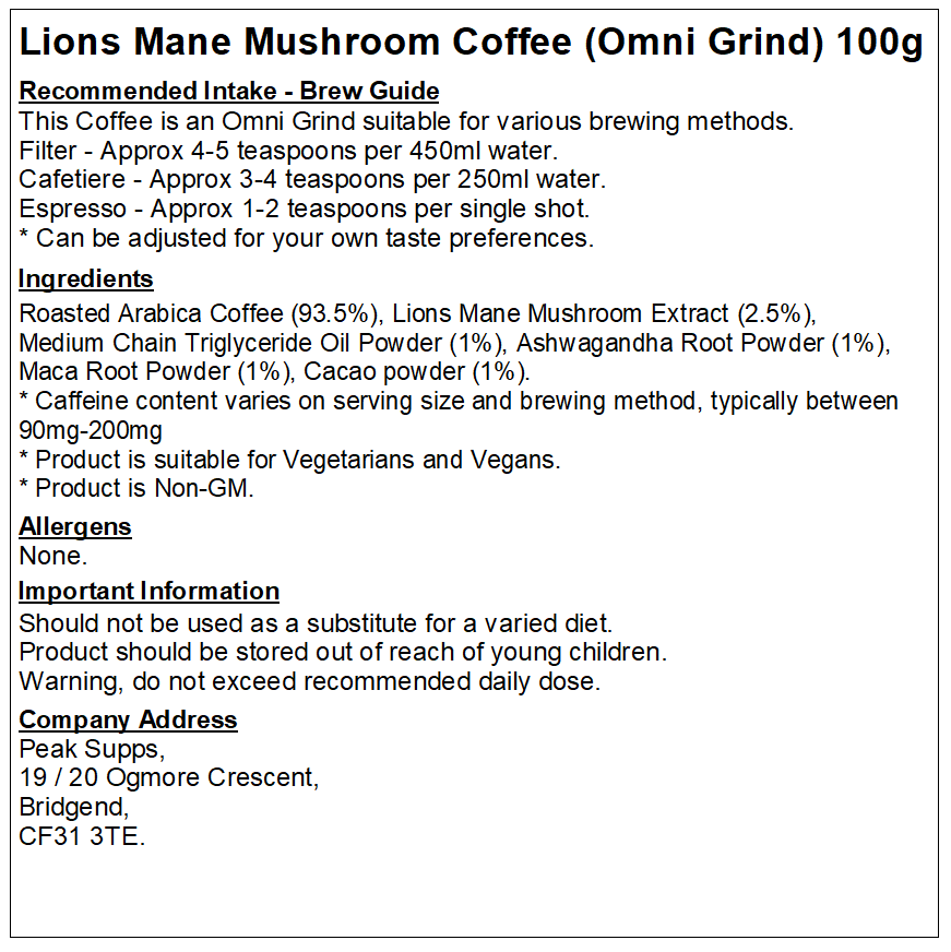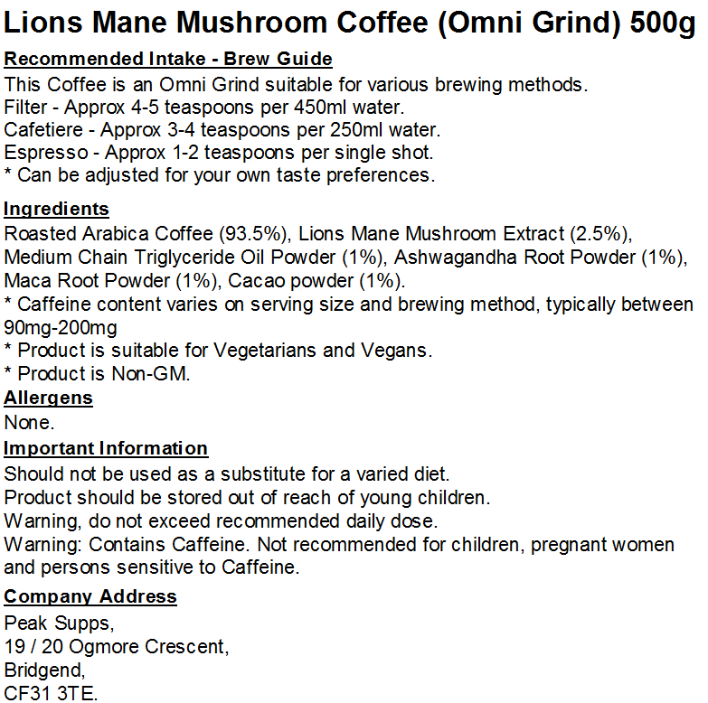 Peak Supps Lions Mane Mushroom Ground Coffee is suitable for those looking for a high-quality food / beverage to add to their daily routine. It is suitable for the general public and athletes.
