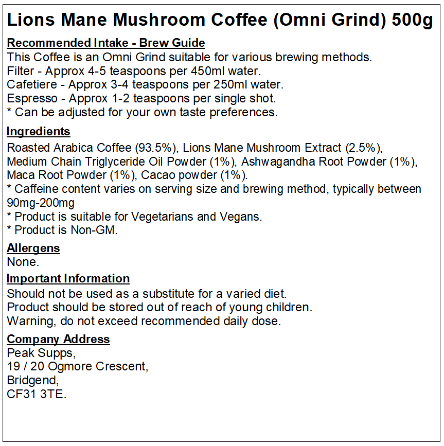 Peak Supps Lion's Mane Mushroom Ground Coffee is a dark roast coffee tailored for the adventurous coffee enthusiast. This ground coffee merges the rich flavour of roasted coffee beans with the earthy, fragrant essence of lion’s mane mushroom, making it perfect for your everyday coffee or a special weekend treat. This blend is designed for those who appreciate a unique twist in their coffee.