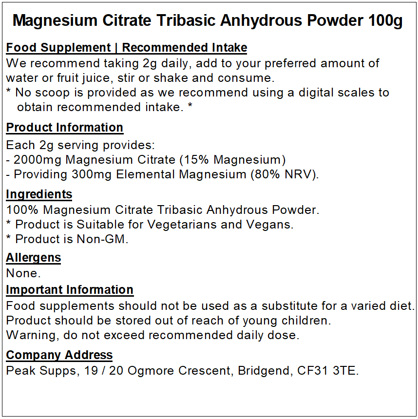 Peak Supps Magnesium Citrate Powder is suitable for those looking for a high-quality Magnesium Citrate supplement. It is suitable for the general public and athletes.