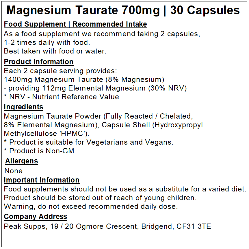 Peak Supps Magnesium Taurate Capsules are suitable for those looking for a high-quality Magnesium supplement. They are suitable for the general public and athletes.