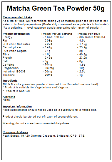 As a food supplement we recommend adding 2g of Matcha Green tea powder to water or juice. (Preferably consumed as regular tea in hot water).