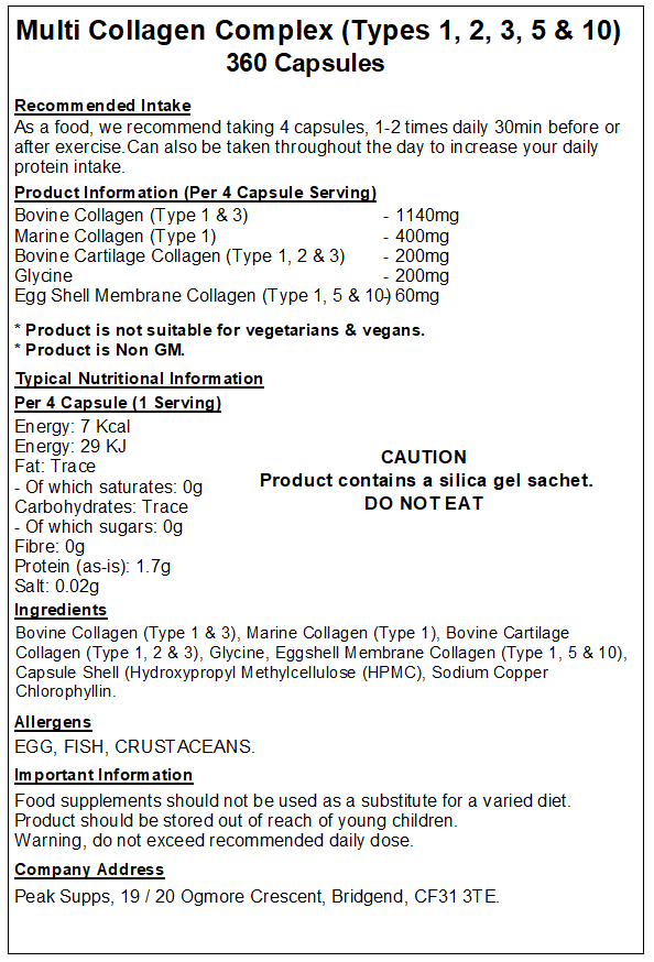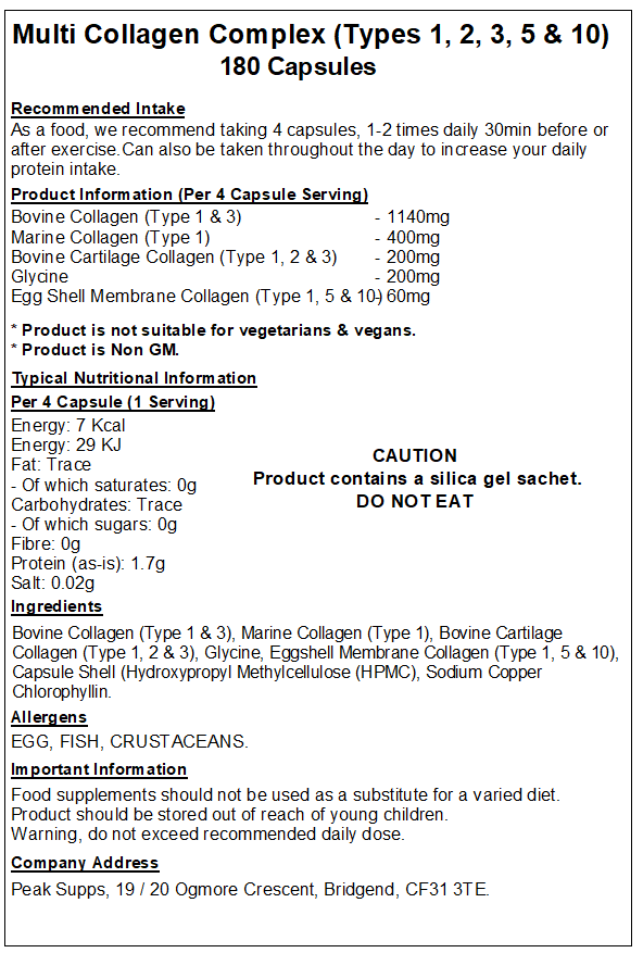 Peak Supps Multi Collagen Complex (Types 1, 2, 3, 5 & 10) provides a combination of four distinct sources of Collagen, all integrated into a single, convenient formulation. Collagen’s main role is to provide structure, strength and support throughout the body. Collagen is a naturally occurring protein that makes up joints, skin, and nails.