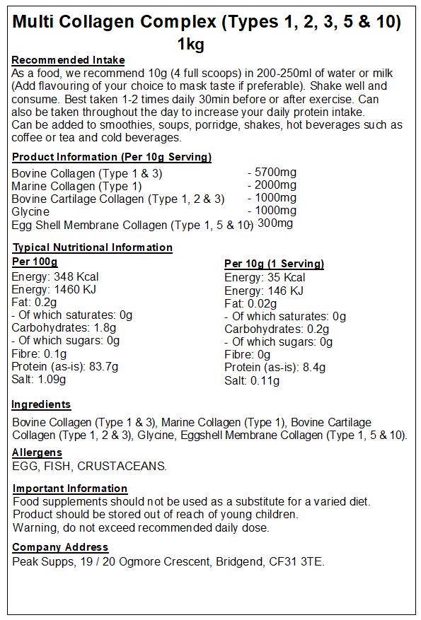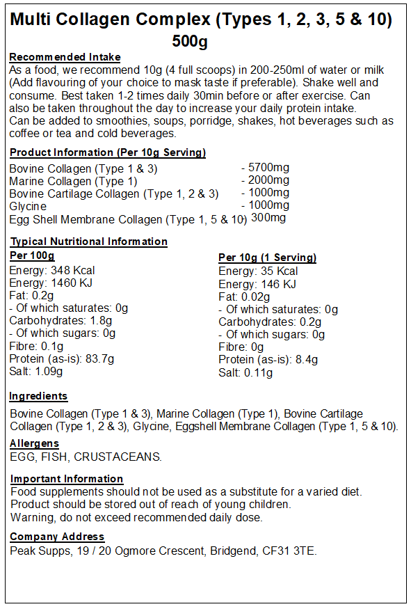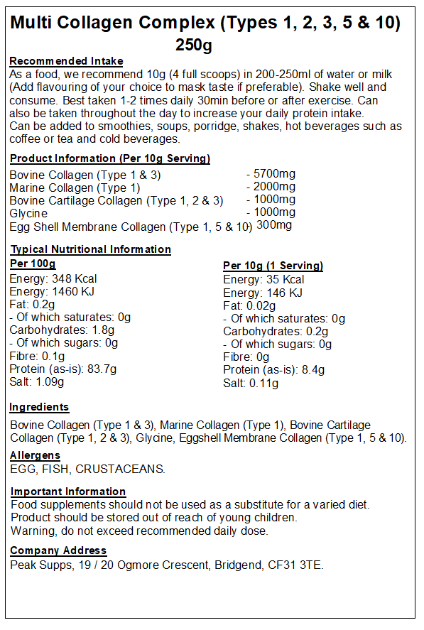 Peak Supps Multi Collagen Complex (Types 1, 2, 3, 5 & 10) provides a combination of four distinct sources of Collagen, all integrated into a single, convenient formulation. Collagen’s main role is to provide structure, strength and support throughout the body. Collagen is a naturally occurring protein that makes up joints, skin, and nails.