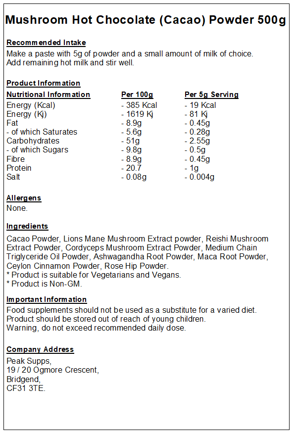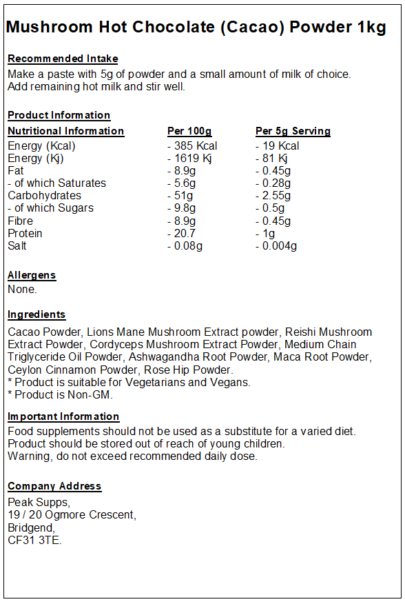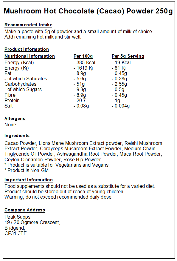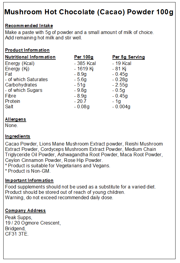 Peak Supps Mushroom Hot Chocolate Powder is suitable for those looking for a high-quality food / beverage to add to their diet. It is suitable for the general public and athletes.