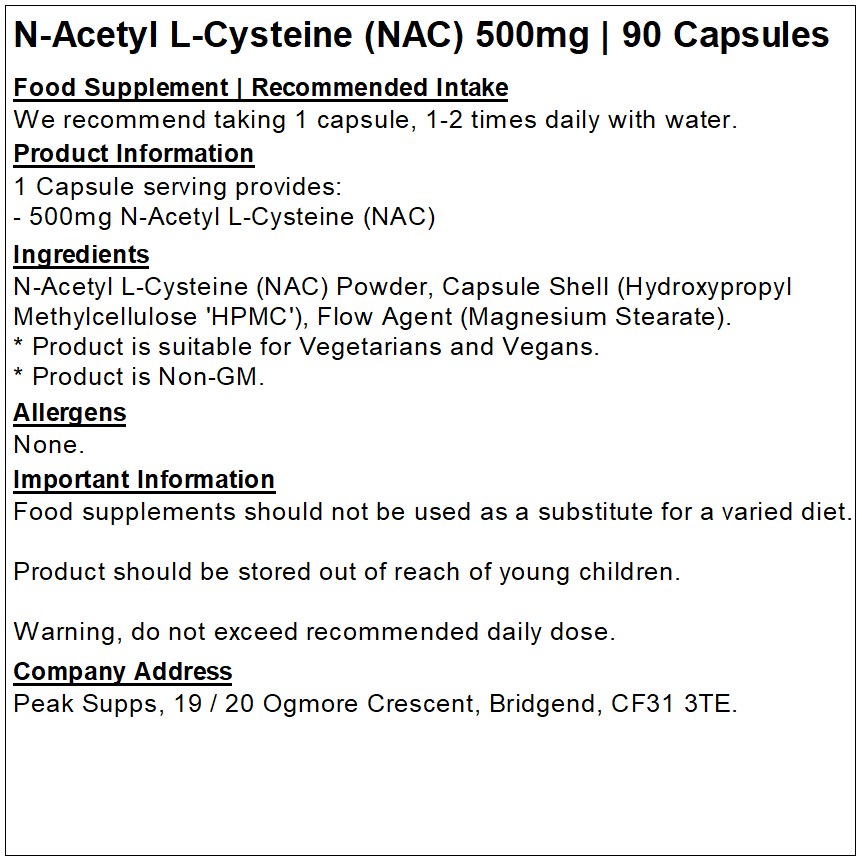 N-Acetyl L-Cysteine (NAC), HPMC Capsule, Flow Agent (Magnesium Stearate).