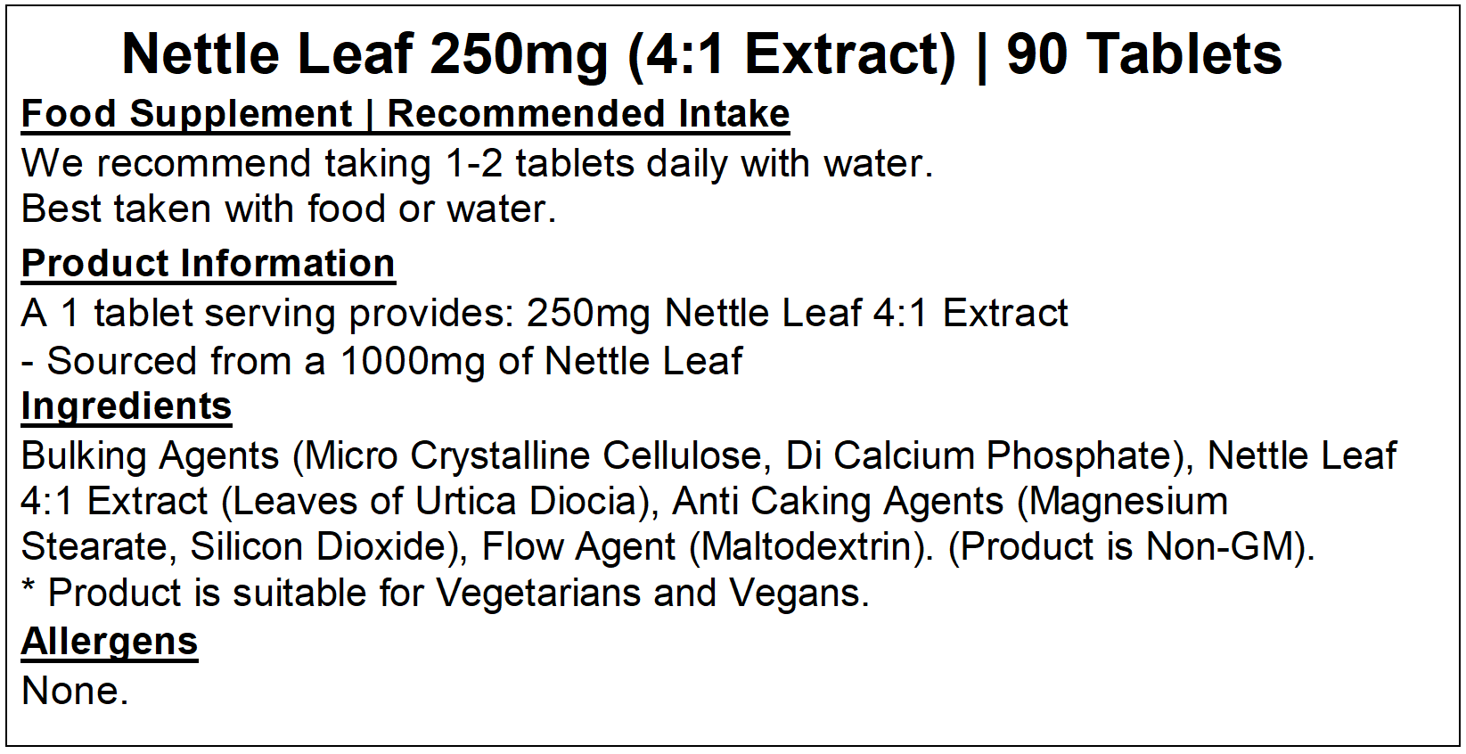 Bulking Agents (Micro Crystalline Cellulose, Di Calcium Phosphate), Nettle Leaf 4:1 Extract (Leaves of Urtica Diocia), Anti Caking Agents (Magnesium Stearate, Silicon Dioxide), Flow Agent (Maltodextrin).
