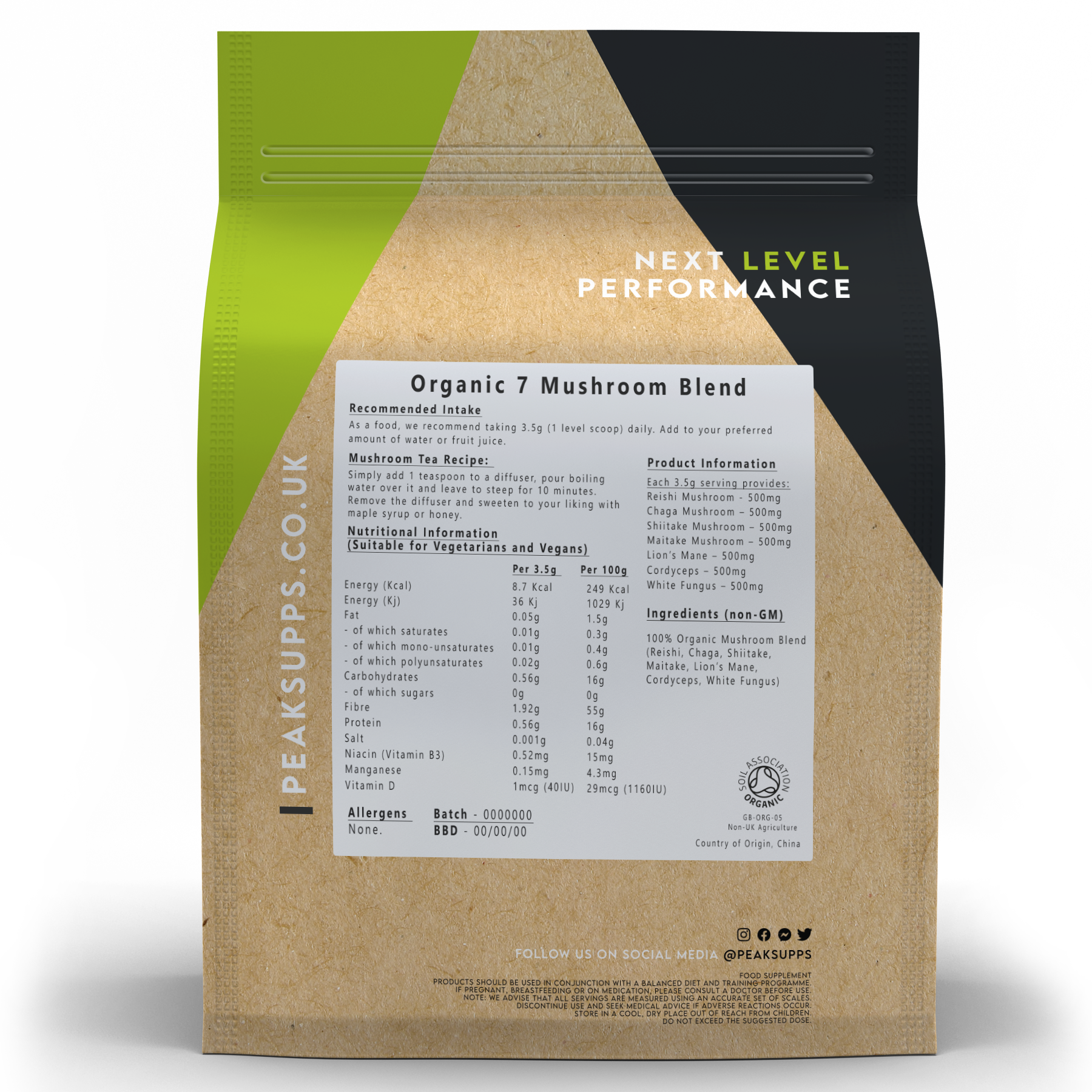 Peak Supps Organic 7 Mushroom blend is a mix of seven carefully selected mushrooms which include Reishi, Chaga, Shiitake, Maitake, Lion’s Mane, Cordyceps & White Fungus. 100% of the fruit bodies are used in the making of this blend.