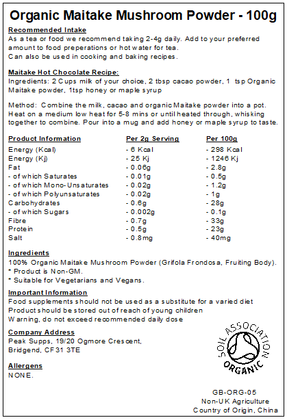Peak Supps Organic Maitake Mushroom Powder is made using the fruiting body of the Grifola Frondosa mushroom. It is harvested, dried, granulated and finally ground into a fine powder. It is pale-brown in colour and has a nutty/woody taste and smell.