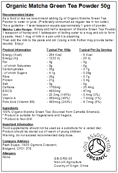 Peak Supps Organic Matcha Green Tea is a made from handpicked and dried premium tea buds from the Camellia Sinensis plant and is finely milled into a green powder. Matcha is commonly used as a food ingredient in baking and drinks. It can also be used as a natural food dye.