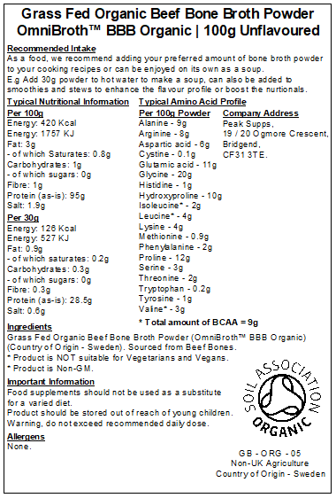 Bone broth is rich in protein, collagen, glucosamine, chondroitin and other key minerals. Due to being sourced from beef bones, this product is extremely rich source of Collagen. Primarily Collagen Type 1 & 3. It is also certified Organic by the Soil Association (GB-ORG-05).