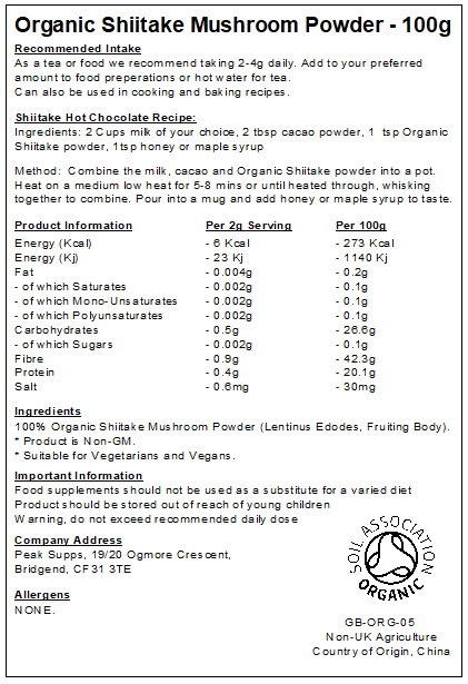 Shiitake naturally contains the polysaccharide Lentinan and beta-glucans, a natural sugar that is more abundantly found in oats and barley. Our Organic Shiitake Powder can be added to soups, smoothies and baked goods and is suitable for vegans and vegetarians.