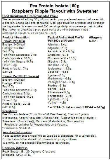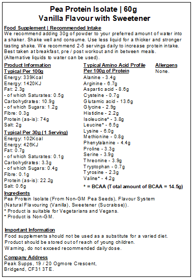 Peak Supps Pea Protein isolate is a source of protein for vegans and vegetarians looking to add protein to their diet. Preserving and building muscle can be a common issue for vegetarians and vegans, due to limited protein sources. Protein contributes to the maintenance and growth of muscle mass. Our pea protein isolate is a great source of amino acids as well as protein.