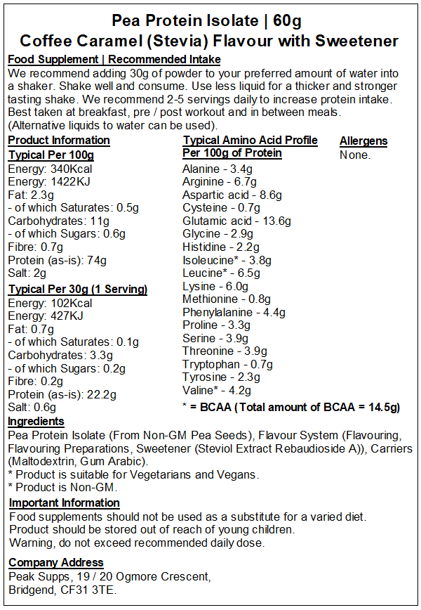 Coffee Caramel Stevia - Pea Protein Isolate 80%, Flavour System (Flavouring, Flavouring Preparations, Sweetener (Stevia Extract Rebaudioside A), Carriers (Maltodextrin, Gum Arabic).