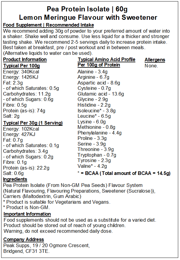 Lemon Meringue - Pea Protein Isolate 80%, Flavour System (Natural Flavouring, Flavouring Preparations, Sweetener (Sucralose)), Carriers (Maltodextrin, Gum Arabic).