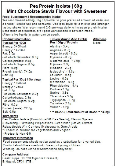 Mint Chocolate Stevia - Pea Protein Isolate 80%, Flavour System (Flavouring, Flavouring Preparations, Sweetener (Stevia Extract Rebaudioside A), Carriers (Maltodextrin, Gum Arabic).
