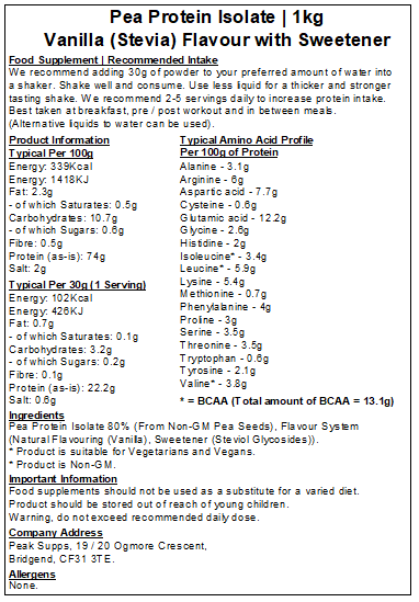 Vanilla - Pea Protein Isolate 80%, Natural flavouring (Vanilla), Sweetener (Sucralose).