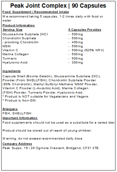 Our Peak Joint Complex Capsules combine 7 popular joint support supplements at high dosages. These include Vitamin C, MSM, Glucosamine, Chondroitin, Turmeric, Marine Collagen & Hyaluronic Acid.