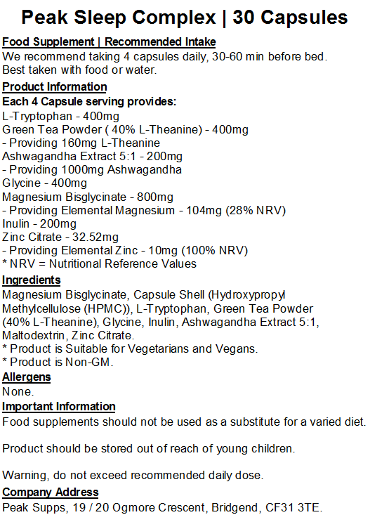 Peak Sleep Complex combines 7 popular sleep supplements in convenient capsule form. Amino acids such as Glycine, L-Theanine & L-Tryptophan are used for a number of bodily functions including creating proteins and enzymes. They are broken down into three different groups: essential, non-essential and conditional amino acids.