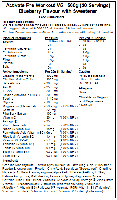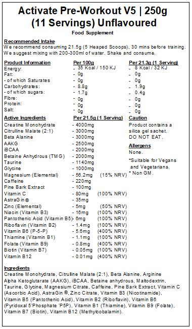 Activate Pre Workout powder now provide BCAAs to aid with protein synthesis. With an optimal ratio of 2:1:1 between Leucine : Isoleucine : Valine. They are essential amino acids which are not produced in the body and are a vital building blocks of protein. It also contains Betaine Anhydrous, also known as Trimethylglycine (TMG), which is the amino acid glycine with three methyl groups attached to it.