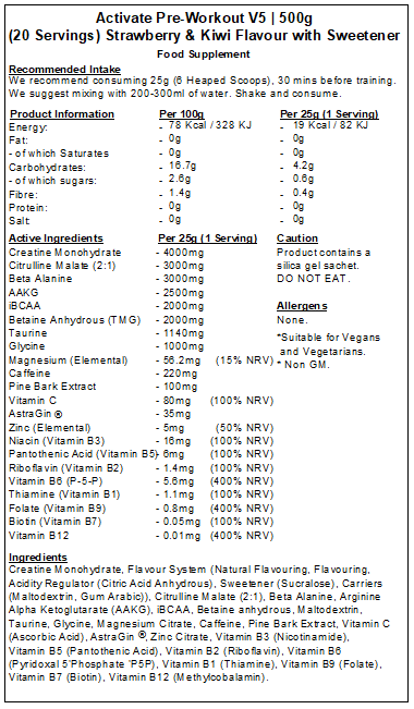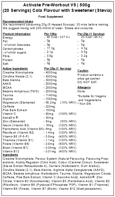 Activate is specifically formulated to enhance athletic performance and mental alertness. Activate includes a combination of ingredients at powerful yet safe doses to help increase training intensity. A full ingredient list and dosages are stated in the nutritional information tab.