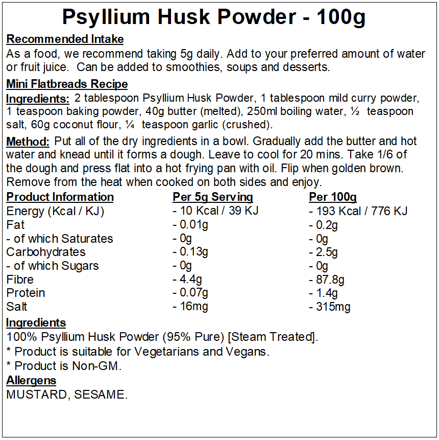 100% Psyllium Husk Powder (95% Pure) (Steam Treated).
